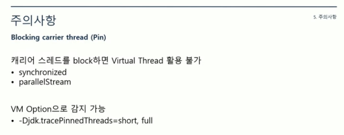 주의 사항으로는 virtual thread를 풀로 사용하게 되면 오히려 성능이 어마어마하게 줄어들 수 있기에 사용하면 안 됩니다